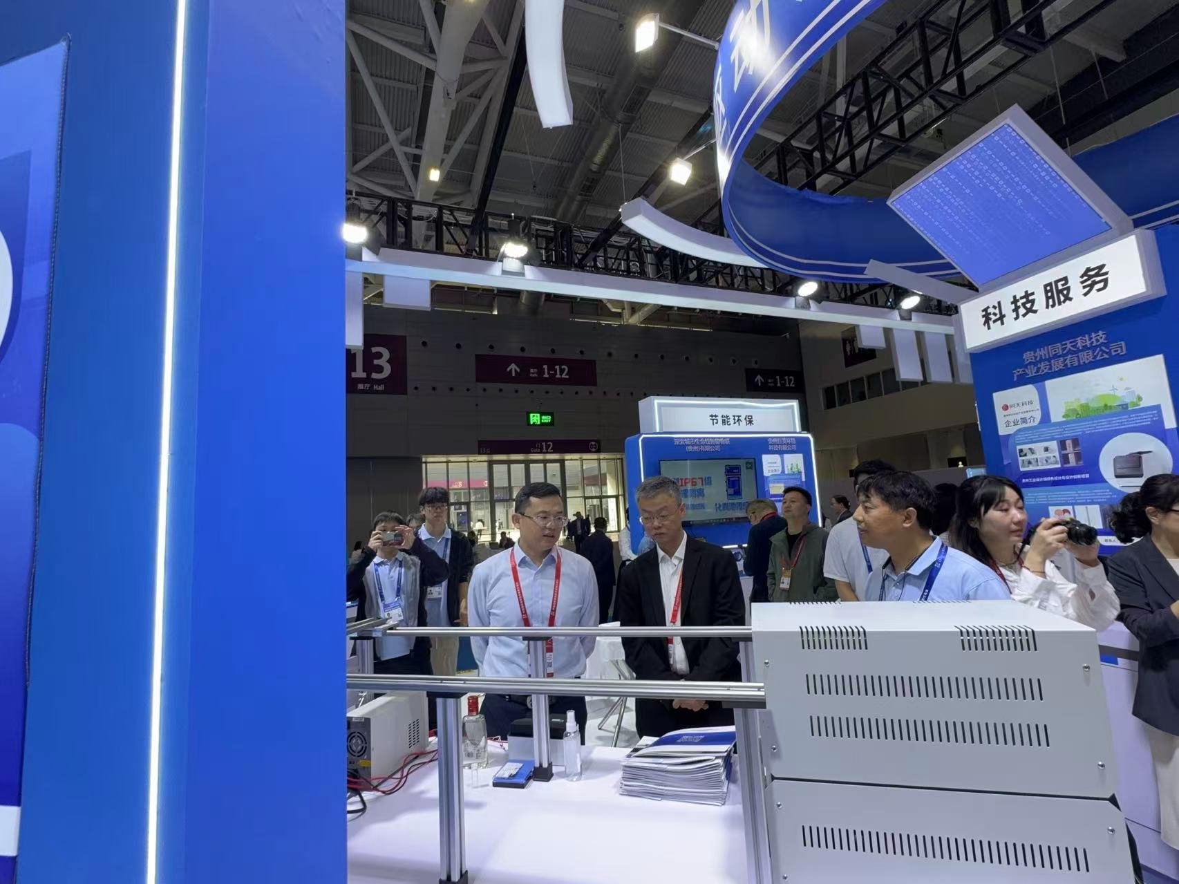 展会上,贵州省科技厅副厅长吴岸琪(中)、贵州省发展和改革委员会副主任兰青(左)在现场参观指导,对杨文韬教授(右)的红外线测温仪成果给予了高度评价。