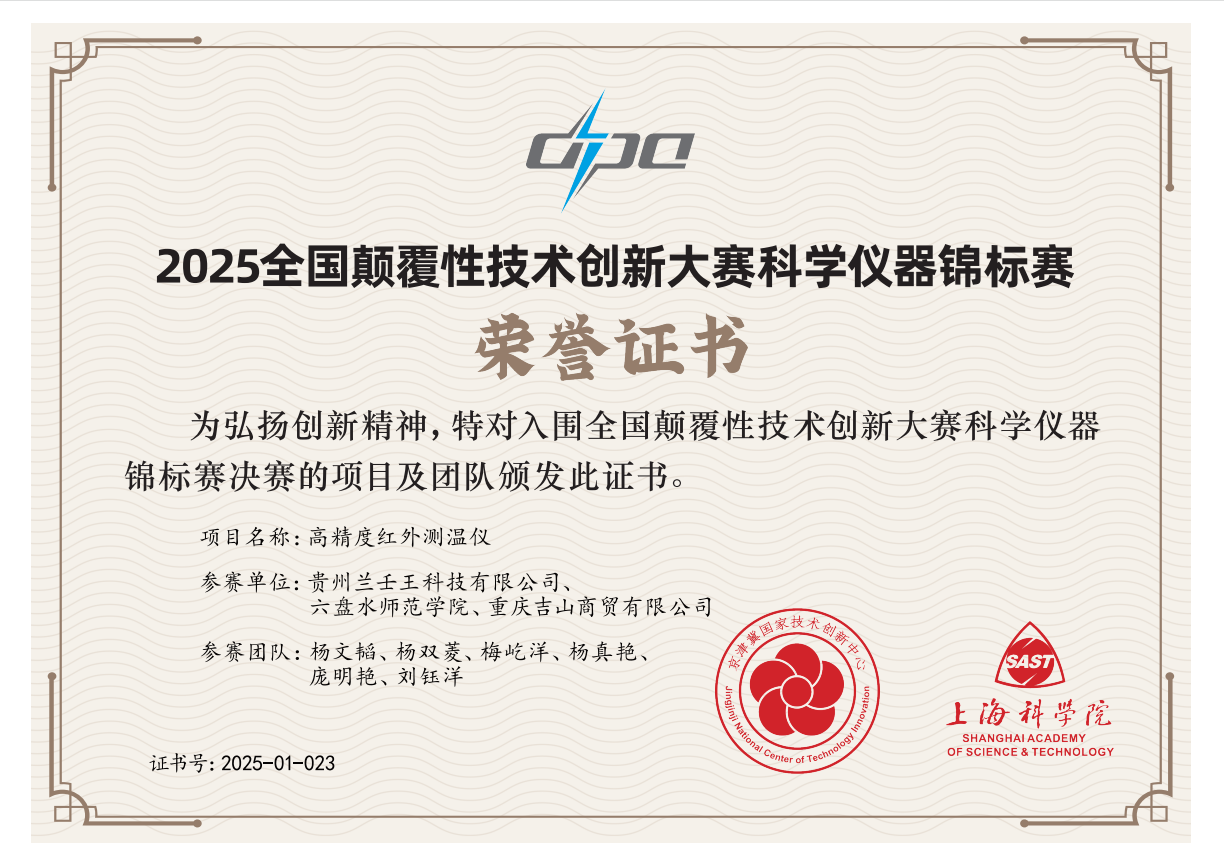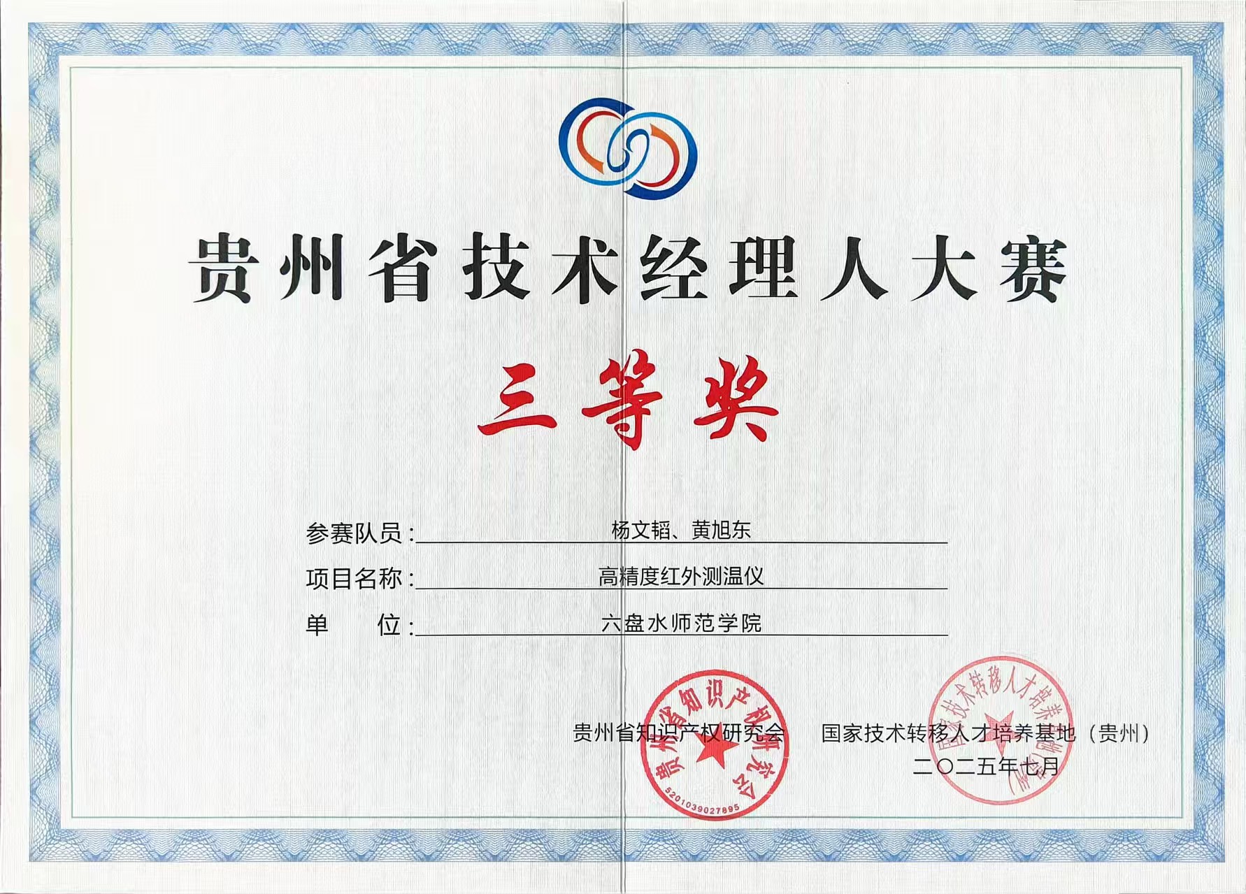 六盘水师范学院与贵州兰壬王科技有限公司共同选送的参赛项目《冶金用工业红外线测温传感器》在2024年“智赋杯”第一届贵州高校科技成果转化路演大赛“成果转化赛道”荣获优秀奖。